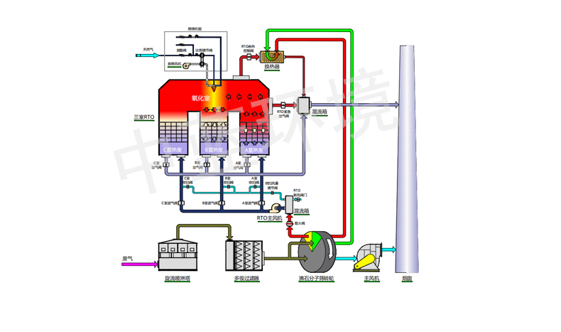 3. RTO氧化階(jiē)段:沸石轉輪實際上是個濃縮裝置,把低(dī)濃度大風量有機廢氣裏的分(fèn)子捕捉、富集到沸石分子篩上麵。當脫附時就(jiù)能用(yòng)很小的