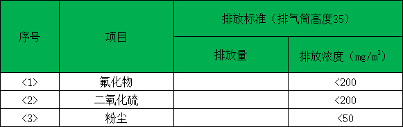 (8)排放標準,執行以下排放(fàng)要求:二氧化硫濃度<200mg/m3 ,氟(fú)化物濃度<200mg/m3,粉塵濃度<50mg/m3並具有可滿足更高標準的調節裕量。